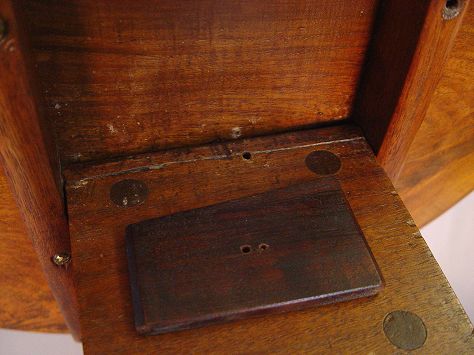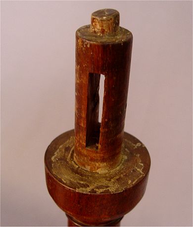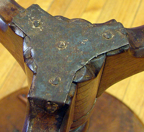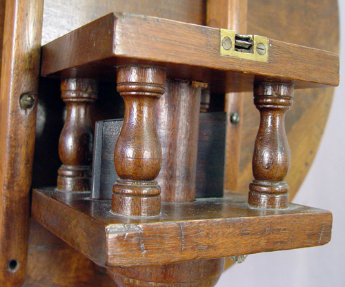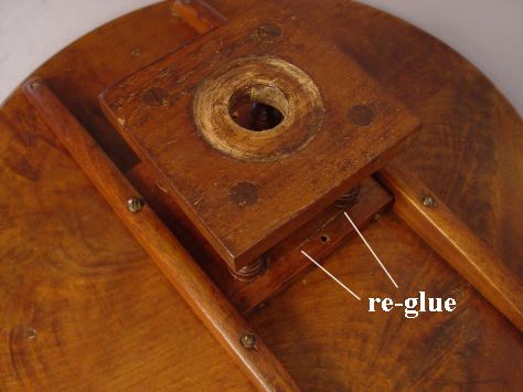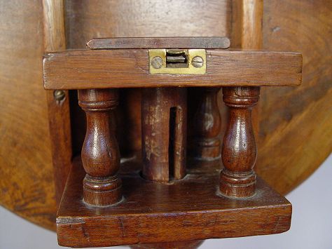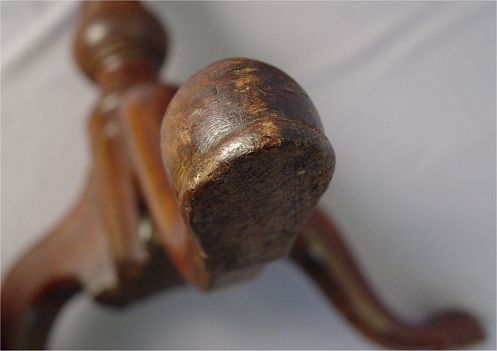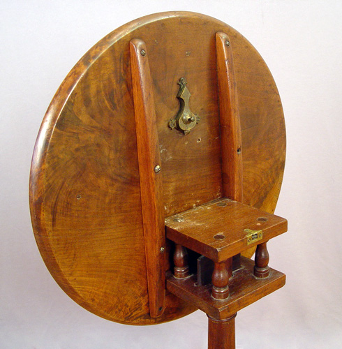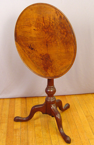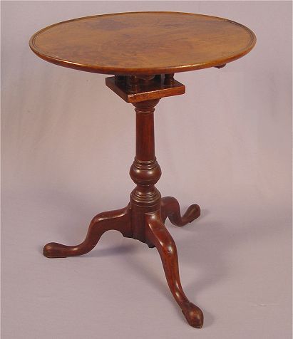 PHILADELPHIA QUEEN ANNE TILT-TOP TEA TABLE: Circa 1770. Mahogany construction. Dished crotch grain walnut top tilts and turns on a ''bird-cage'' device, turned column on ''compressed ball'' base. Plain pad feet. 27''h x 21''dia.