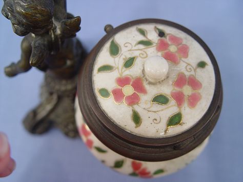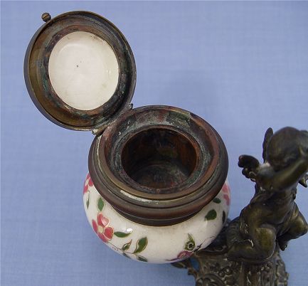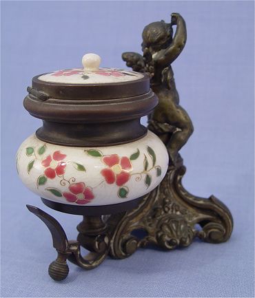 FRENCH PORCELAIN INK WELL AND FIGURAL BRONZE PEN HOLDER: Scrolling bronze stand supports the paint under glaze porcelain ink well and the bronze cherub pen holder, no insert for ink, generalized crazing to porcelain, approx. 5 1/2'' x 5 1/4'' x 3 1/2''.