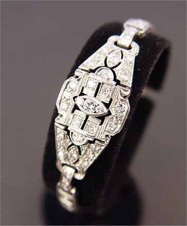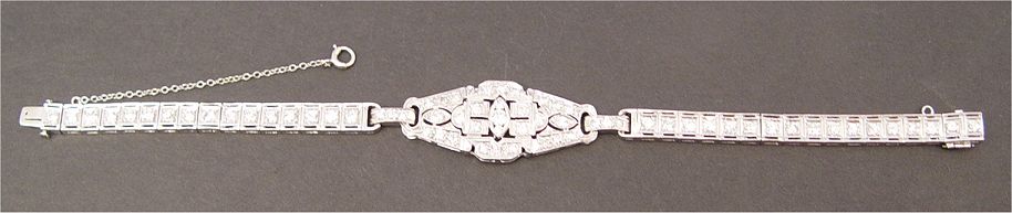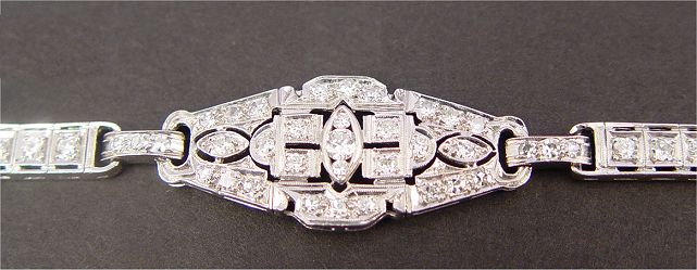 PLATINUM AND DIAMOND DECO BRACELET: Shaped and hinged mounting of platinum encrusted with 68 old Euro, round brilliant and single round cut diamonds, 4ctw, VS1-SI1 clarity and H-I-J color, bracelet with more age then center panel, 7''l., pressure clasp with hidden safety plus safety chain, 16 grams. Sold with current Florida Diamond Appraisers appraisal, retail replacement value $8,250. Est. $3000/4000**