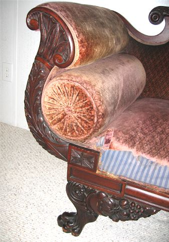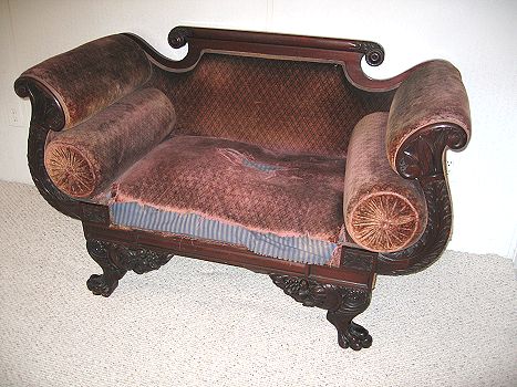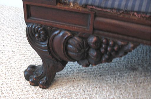 FEDERAL CARVED MAHOGANY SETTEE: Hairy paw feet, fruit carvings under the skirt, bolster pillows under the rolled arms. Sturdy frame, very worn upholstery. 34 1/2''h. x 56''l. x 26''d.