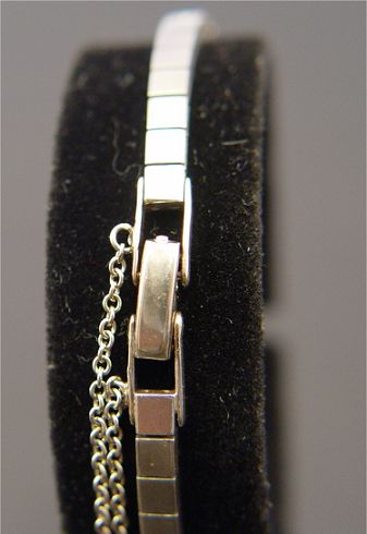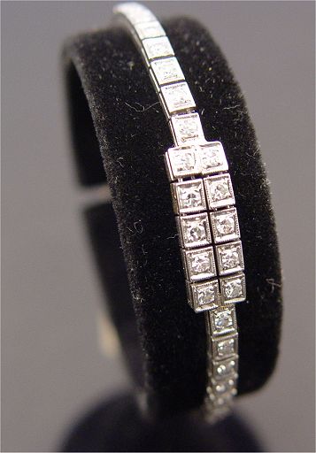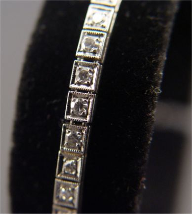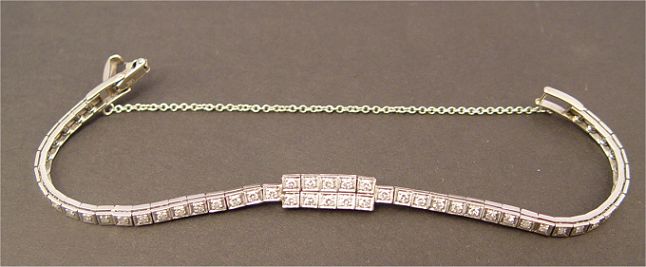 DIAMOND LINE BRACELET: 14k white gold square links set with small diamonds, approx. 6 1/2''l., double clasp plus safety chain, 10 grams.