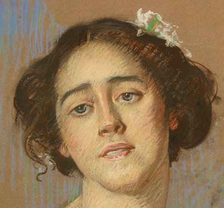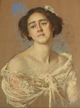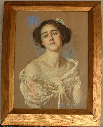 HIGH QUALITY ILLEGIBLY SIGNED PASTEL PORTRAIT OF A YOUNG WOMAN: Probably early 1900's, American, 23 1/2'' x 18'', period oak frame with gold overpaint, 29'' x 24''. Small tear in upper margin, not in image.