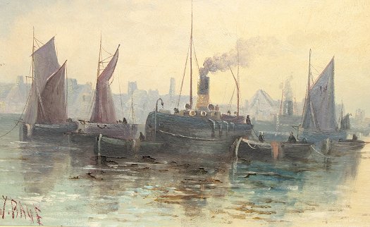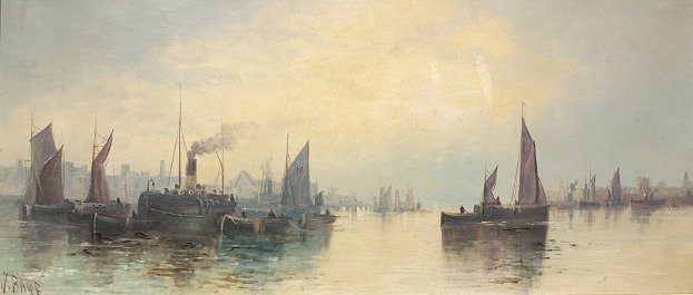 PANORAMIC HARBOR SCENE SIGNED BAYE?: Early 20th C., 14 1/2'' x 32 1/2'', period gilt frame with wear, 22'' x 40''.