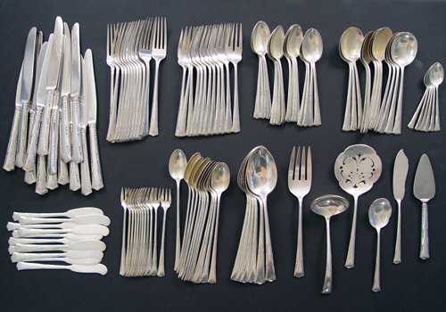 GORHAM STERLING FLATWARE IN THE GREENBRIAR PATTERN: 105 piece service for 12 to include 12 knives, 12 forks, 12 salad forks, 12 soup spoons, 12 ice tea spoons, 16 teaspoons, 6 serving spoons, 11 butter knives, 6 demitasse, meat fork, sugar shell, tomato server, gravy ladle and two extra dinner knives a bit longer.