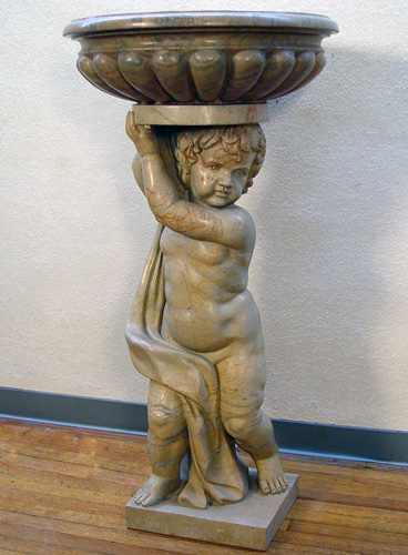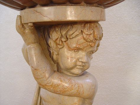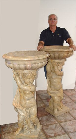 4 FT TALL MARBLE CUPID STATUE BIRD BATH OR GARDEN URN: Pink marble, two piece construction, 46 3/4''h., bowl 23 3/4''dia. One of two we are offering.