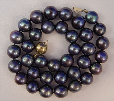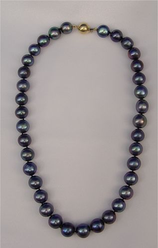 16'' STRAND OF CULTURED TAHITIAN BLACK PEARLS: 9.9 to 11.7mm double knotted pearls, colors to include silver, green, blue and purple overtones, 14k yellow gold ball clasp. Sold with current Tampa Gemological Laboratory appraisal, replacement value $9400. Est. $1300/1500**