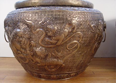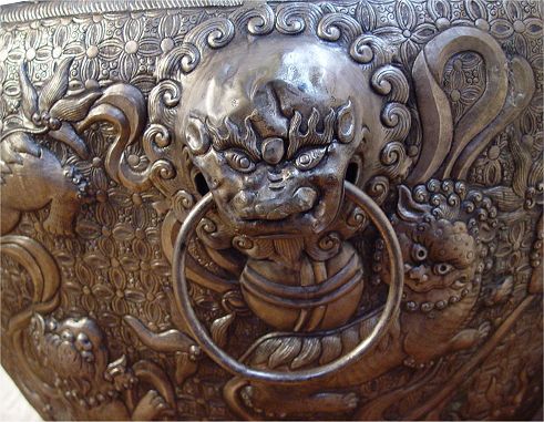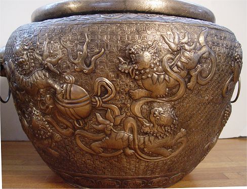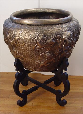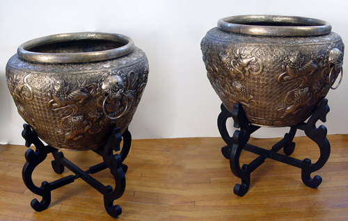 PAIR OF EMBOSSED BRASS PALACE JARDINIERE WITH STANDS: Embossed design to jardiniere in a foo lion motif, rolled rim with etched design, double masqueron and ring handles, black hinged wooden stands. Jardiniere measures approx. 33'' at widest and 20''d., overall 36''h.