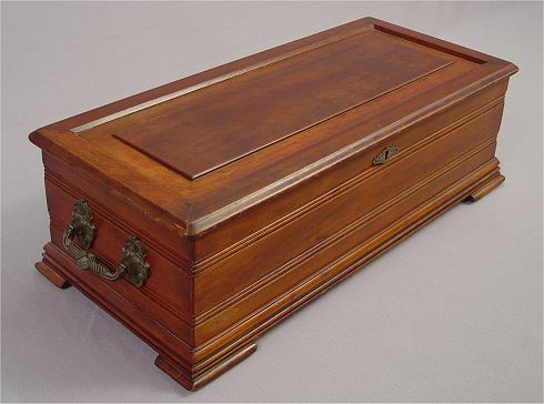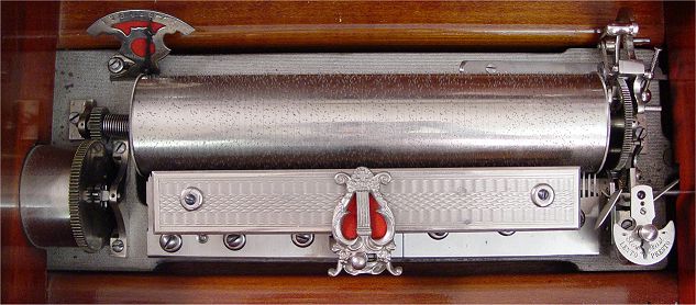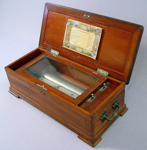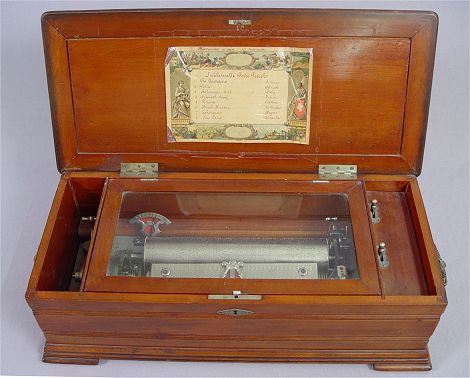 19TH C ROSEWOOD MUSIC BOX: 8 tunes with song list posted on lid, cylinder measures 11''l. and approx 2 1/2''dia. Overall 7 1/2''h x 23''l x 10 1/2''.