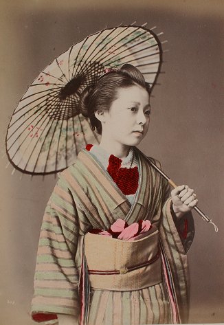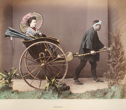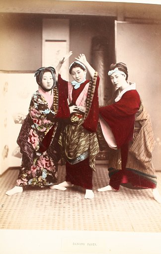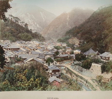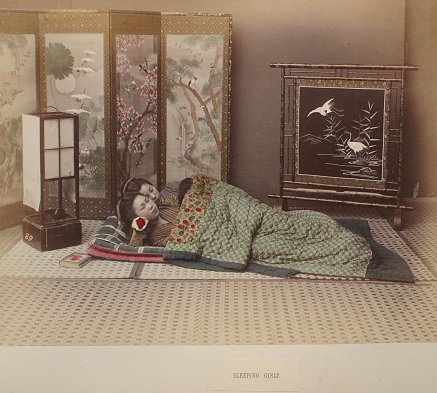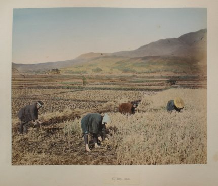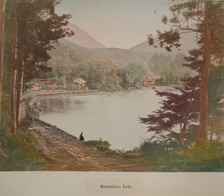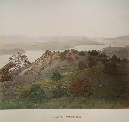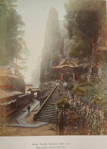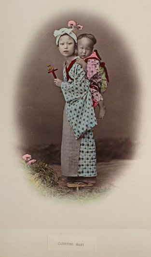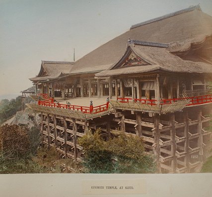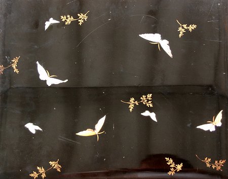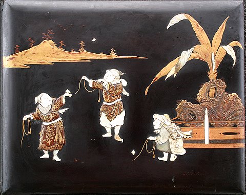 19th C. LACQUER ORIENTAL PHOTO ALBUM WITH IMAGES BY KUSAKABE KIMBEI: Over 50 hand colored images of Japan and Japanese people contained in an intricate Black lacquer album that is inlaid with mother of pearl, carved wood, ivory, bone, and various stones, with the front cover depicting children playing with a top, set in a landscape, the back cover decorated with butterflies, both sides accented with gold leaf paint. Some dents and scratches, but good overall. Album cover measures 11 3/4'' x 15 1/2'', overall approx. 16'', depth of album is 2-2 1/4''. Call for condition on the photographs. Est. $2000/4000**