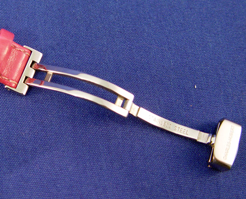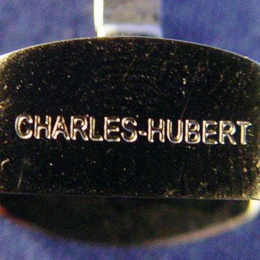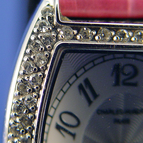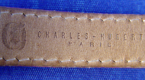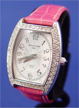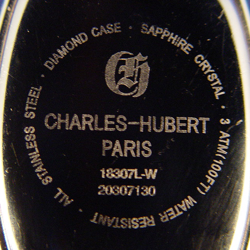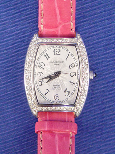 CHARLES HUBERT PARIS BALEEN DIAMOND LADIES WATCH: This watch has 74 diamonds of about 1 point each totaling .74 CT, of SI-1 Quality and F-H in color. Tonneau shaped wrist watch circa 2003, Diameter not including crown is 25 mm, Lug tip to Lug tip 33 mm, stainless steel case, dial color is white and silver, silver Dauphin hands, Arabic numerals, Case marked All Stainless Steel, diamond case, sapphire crystal, 3 ATM(100FT) Water resistant, Charles-Hubert Paris, 18307L-W, 20307130, Quartz movement, sapphire crown, leather band, overall length 8 1/4'', adjustable stainless steal clasp looks like a buckle on the outside marked Charles-Hubert. Needs a new battery. All clocks and watches are sold as not working, due to their delicate nature, even though they may be just fine.