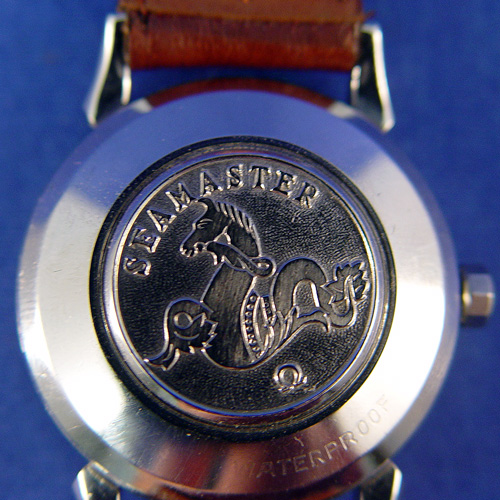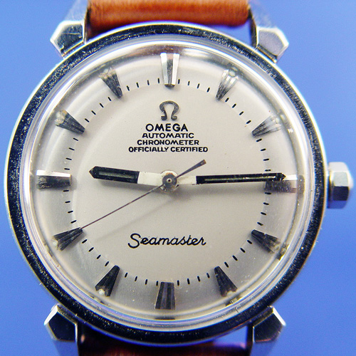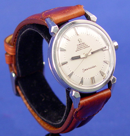 VINTAGE GENTLEMAN'S OMEGA SEAMASTER WRIST WATCH: Dial marked Omega Automatic Chronometer Officially Certified Seamaster, Omega mark to stem and center of back, back marked Waterproof, 1 11/16'' lug to lug end, 1 5/16'' across. Model 505, works 16103400, inside case 2984 1 SC 2989. Currently on a leather band 20mm, 9 1/8''l. overall. Watch currently not in working order, signs of rust to support screws and slightly visible to works, Automatic seems to not be working either. All clocks and watches are sold as not working, due to their delicate nature, even though they may be just fine.