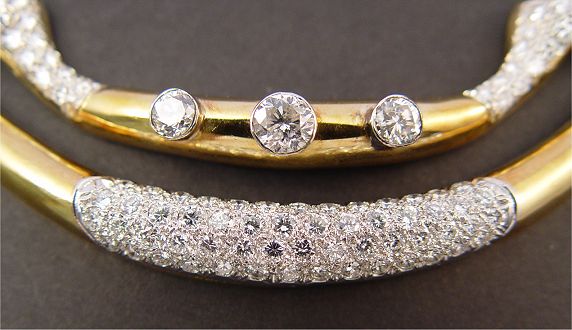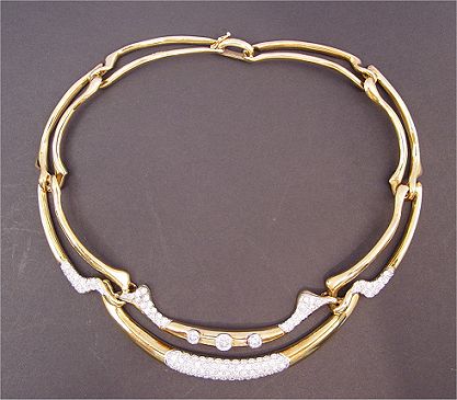 FREE FORM 7ctw DIAMOND AND 18K GOLD CHOKER NECKLACE: 18k yellow gold, acid tested, free flowing collar necklace set with approx. 7ctw of diamonds. Features three bezel set diamonds the center stone being an Old Euro cut of approx. 90pts, I-1 clarity and H color; the two side stones are round brilliant cut, approx. .43 and .47cts, I-1 clarity and H color. The melle consists of approx. 110 diamonds - 109 full cut and 1 single cut, approx. 5ctw, VS clarity and G-H color. Approx. 16''l., approx. 73.4 grams, 47dtw. Gold and diamond specifics from a 2004 appraisal by Diamond Appraisers of Florida, fair market value at that time approx. $6500.00.