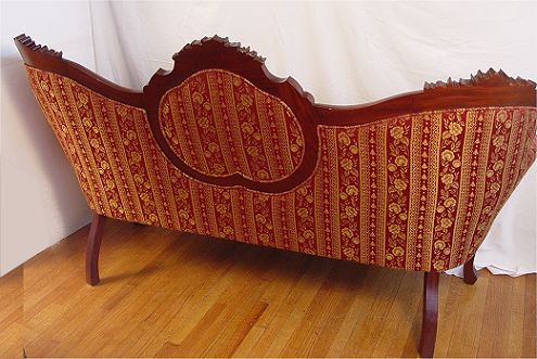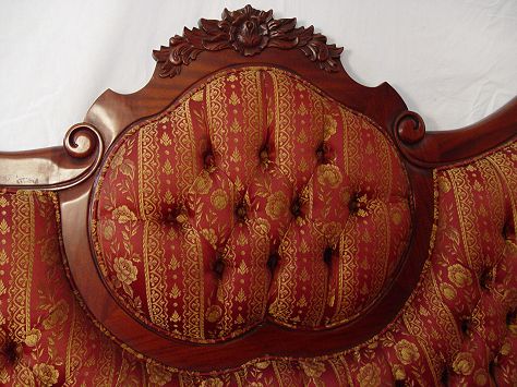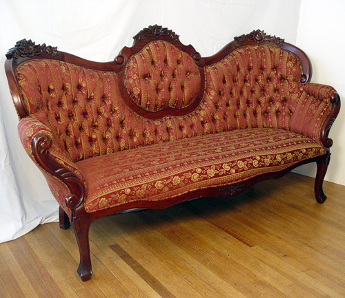 LARGE CARVED MAHOGANY VICTORIAN STYLE SOFA: Maroon brocade style upholstery, firm comfortable seating, button tufted back with central medallion, rolled arms, carved frame in a rose motif, approx. 88''w and 48 1/2''h.