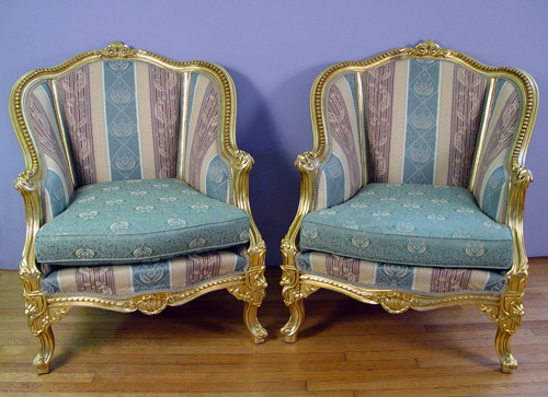 PAIR OF LOUIS XVI FRENCH BERGERE CHAIRS: Gilt carved wood, nicely upholstered, excellent condition fresh from a St. Petersburg estate. 39 1/2''h.