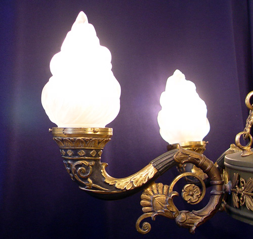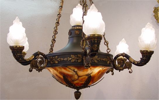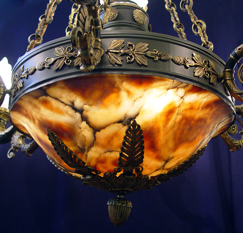 DECORATIVE IRON AND MARBLE CHANDELIER: 7 flame globe shades accent the marble bowl center shade. 43''h x 42''w