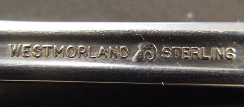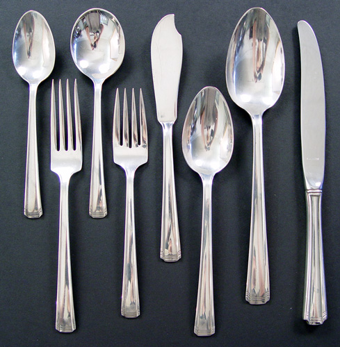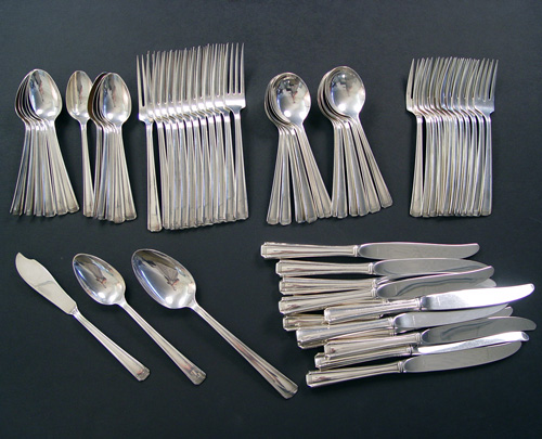 JOHN & PRISCILLA STERLING FLATWARE SERVICE BY WESTMORELAND / WALLACE: 63 piece service for 12 to include 12 dinner knives (9''l.), 12 dinner forks (7 1/4''l), 12 salad forks, 12 soup spoons, 12 teaspoons, a serving spoon, tablespoon, and a master butter. No monogram.