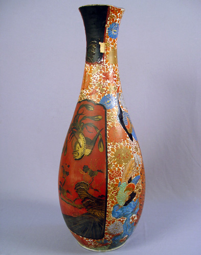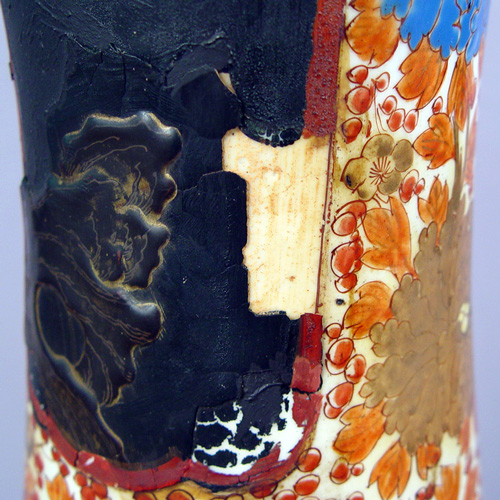 GIANT SATSUMA LAMP VASE: Originally a larger Satsuma vase, after accidental shortening sometime in the past, it was converted into a lamp base, currently no wiring, please note some of decoration is gone, 34 1/2''h.