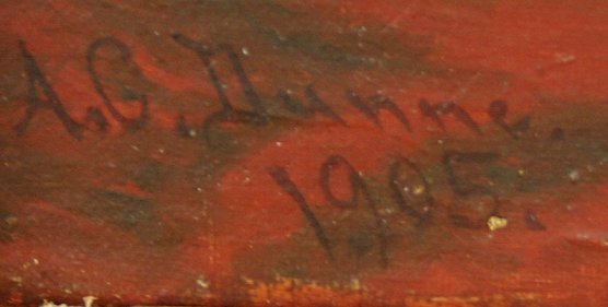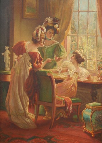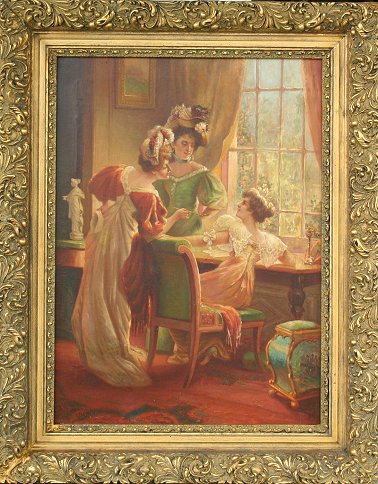 DUNNE, A.G.(European, 19/20th C.): Three Women in a Parlor, O/C, 30'' x 22'', signed and dated 1905, heavy carved and gilded frame with minor wear, 38'' x 30''. Relined.