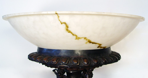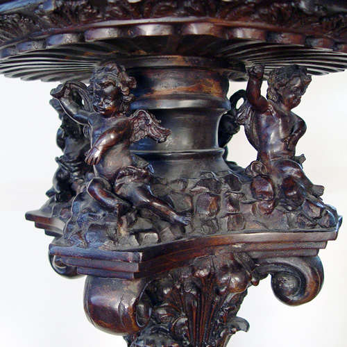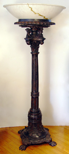 OVER 6 FT TALL BRONZE CHERUB MOTIF TORCHIERE: Base with paw feet and cherubs, the bowl shade mimics marble. Approx. 76''h., the shade is 36''dia.
