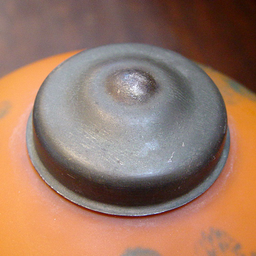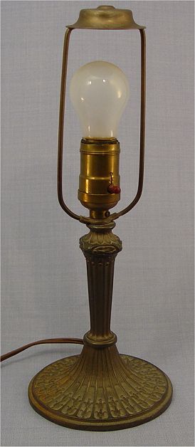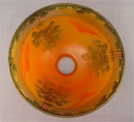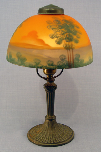 REVERSE PAINTED PITTSBURGH BOUDOIR LAMP: The underside of the base bears the Pittsburgh P L B & Co mark. Reverse painted scenic landscape in vivid colors. 13 1/2''h, the shade is 8 1/4'' dia.