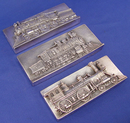 EMBOSSED SILVER TRAIN ENGINE PAPERWEIGHT PLAQUES: Set of three velvet backed plaques of embossed silver, acid tests 925, one marked 999, purported to be by Polish American silversmith Henryk Winograd. ''Great Northern 410'', 2 5/8'' x 6 1/4''; ''America'' 2 3/8'' x 5 3/4''; and ''N.Y.C. BH. R.R.R. 999'', 2 9/16'' x 6 1/8''. Sold as a lot.