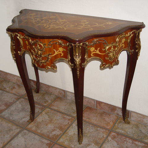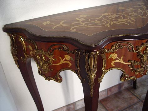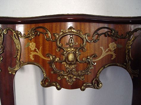 FRENCH PARQUETRY & ORMOLU HALL TABLE: Serpentine front, sides and apron, long cabriole legs. 32''h. x 39'' x18 1/2''. Fresh from a St. Petersburg estate.
