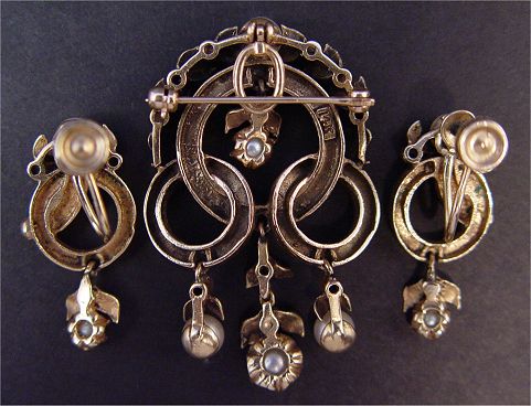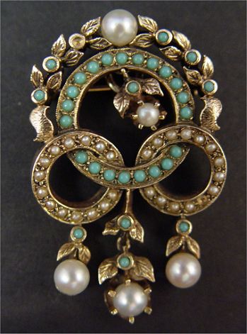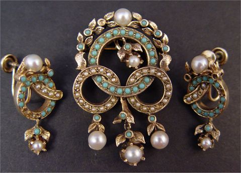 VICTORIAN PEARL AND TURQUOISE SUITE: Brooch with pendant loop and screw back earring ensemble of 14k yellow gold set with white pearls, 5mm and 3mm in brooch 4.5 and 3mm in earrings; seed pearls set to both with one missing from pin/pendant and from one earring; and tiny turquoise cabochons, missing one from pin/pendant, three from each earring. Brooch 1 3/4'', 11 grams; earrings 1''l., 6.8 grams together.