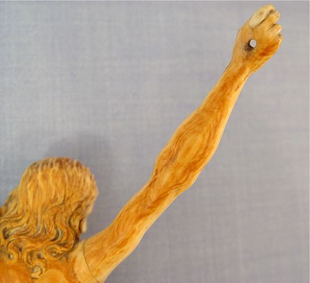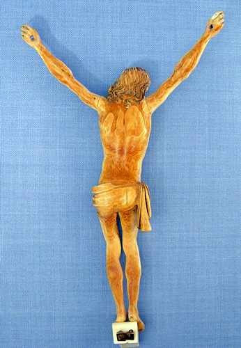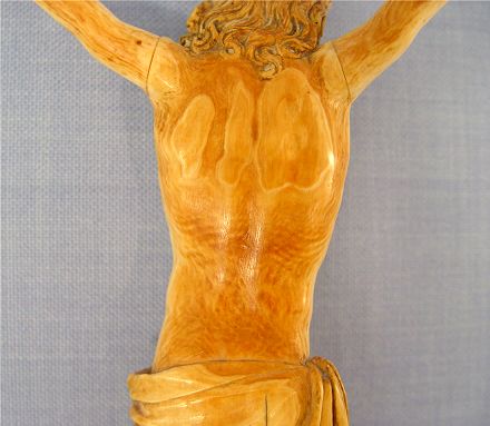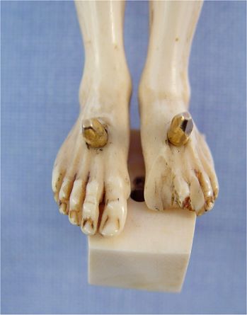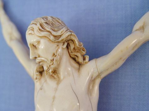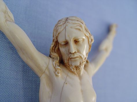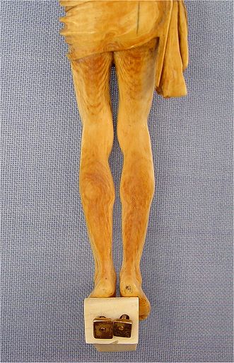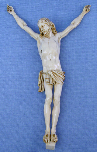 19TH C CARVED IVORY FIGURE OF CHRIST: Highly detailed, once on a crucifix. 10''h., 6 1/4'' at the widest.