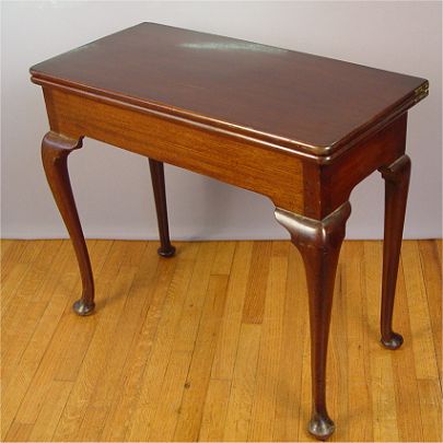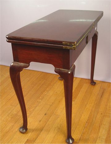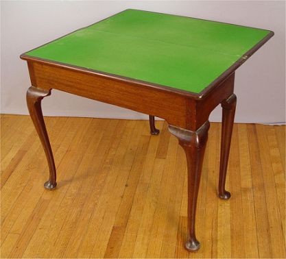 QUEEN ANNE MAHOGANY GAME TABLE: Ca 1800, Swing leg with flip top, 28''h. 32'' X 32'' when open, 32'' x 16'' with leaf closed. Est. $800/1200**