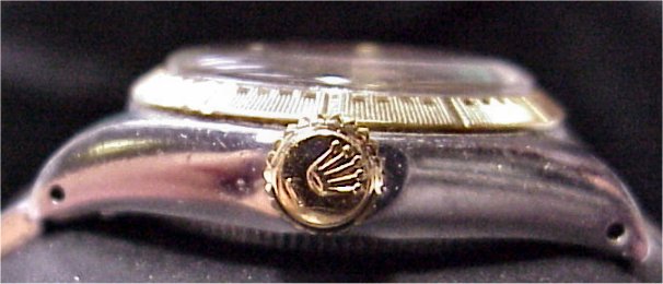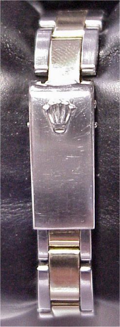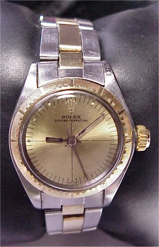 LADIES ROLEX OYSTER PERPETUAL: Stainless and 14k case and band, 29 jewel, gold dial, approx. 6 1/4''l. adjustable to smaller size, kept time for the hour I wore it. We didn't pop the band or back off so at this time I do not have serial numbers for you. All clocks and watches are sold as not working, due to their delicate nature, even though they may be just fine. Est. $2000/2500**
