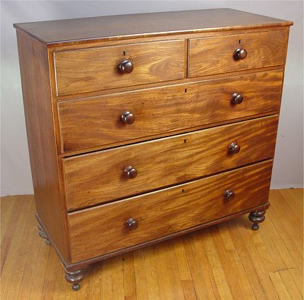 ENGLISH MAHOGANY CHEST OF DRAWERS: Mid 19th C. Solid mahogany, 2 drawers over 3 full length drawers, bun feet. 47''h x 47 1/2w x 20 1/2''d. Est. $1200/1500**