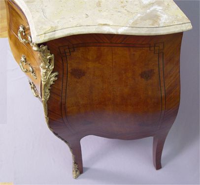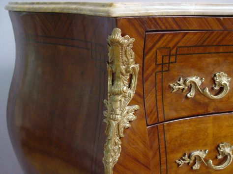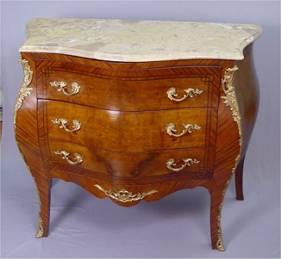 FRENCH ORMOLU MARBLE TOP BOMBAY CHEST: The pink marbles top conforms to the shape of the chest, 3 drawers. 34 x 39 x 18 1/2''.