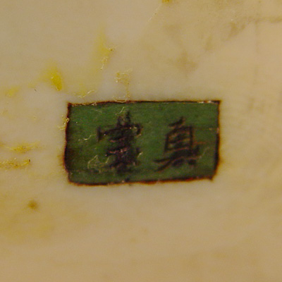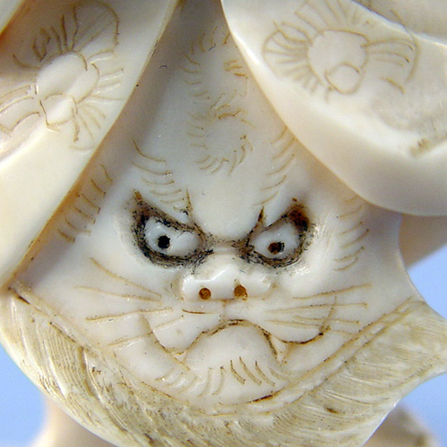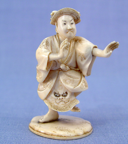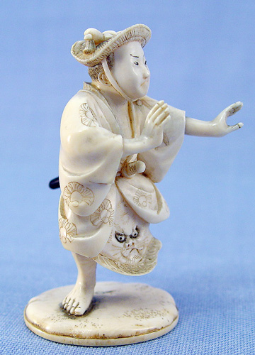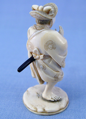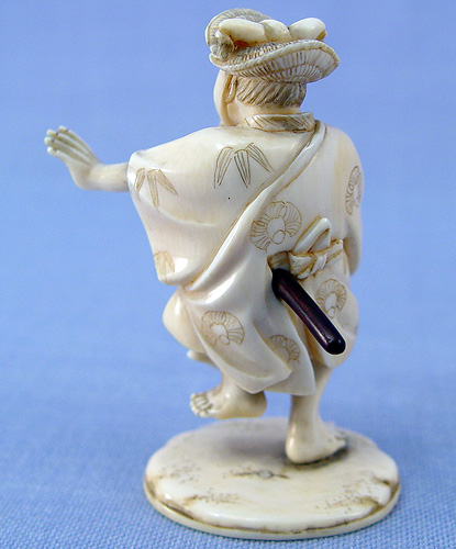 CARVED IVORY FIGURE OF A SAMURAI: Signed, 3 1/4''h., remnants of glue on underside of base where previously attached to a wooden stand.