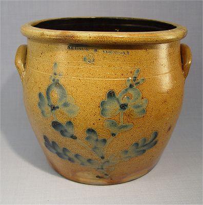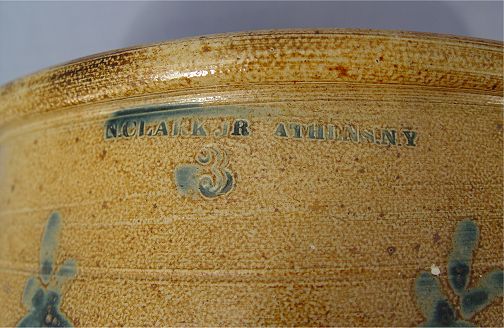 N. CLARK JR. ATHENS NEW YORK 3 GALLON CROCK: With cobalt blue floral decoration, applied handles. Please note 2 hairline cracks visible on the interior. 10''h. x 11 1/4'' dia.
