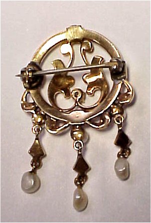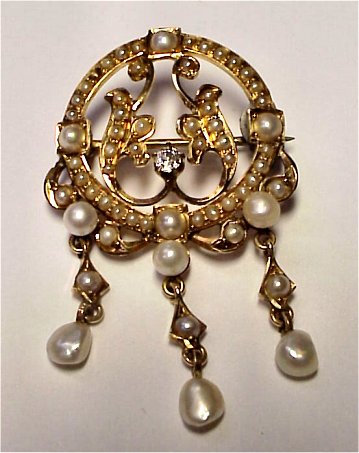14K GOLD SEED PEARL BROOCH: Edwardian style circle pin with dangles, set all over with seed pearls, centered by small faceted clear stone, missing one seed pearl upper left, replacement pin, 1 1/2'', 4 grams.