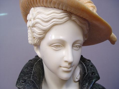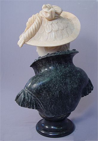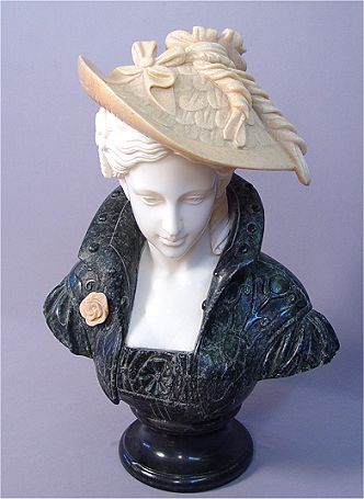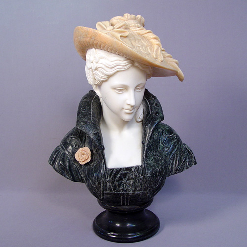 CARVED MARBLE BUST OF A VICTORIAN LADY: Pretty pink hat atop the creamy white maiden dressed in grey, contemporary creation, 26''h.