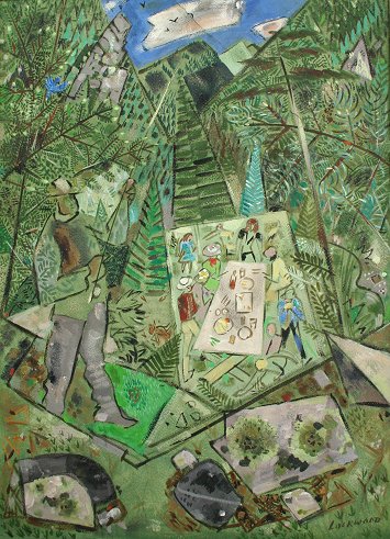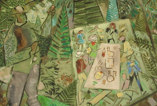 LOCKWOOD, John Ward, (American, 1894-1963): Fly Fishing Outing, Oil/Paper, 25 1/2'' x 18 1/2'' sight size, signed, unframed. Two repaired tears in the upper portion of the piece, with taped repairs verso, will require some further restoration to make perfect. Also several scattered abrasions which reveal paper color underneath; not sure if this was the artist's intended effect, visible by close inspection. Sold as is. Est. $1500/2500**