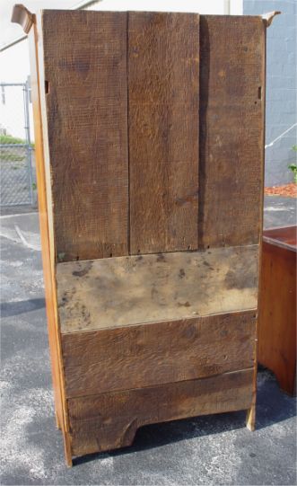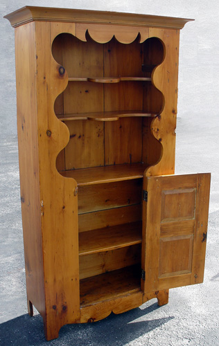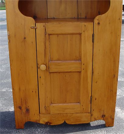 AMERICAN COUNTRY PINE CHINA CUPBOARD: Open shelving with plate grooves. Shaped shelves and front single door on bottom section for blind storage. Paneled back. 73 1/2''h. x 35'' x 14''.