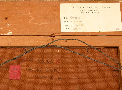 LEWIS, G., (American, 20th C.): ''Big Sur'', O/M, 10'' x 8 1/2'', signed, Dallas North Galleries label verso, titled and numbered verso, original frame, 16 1/2'' x 15''. Cracklure, needs cleaning. Est. $600/800**