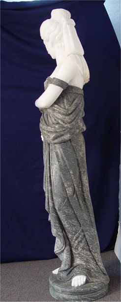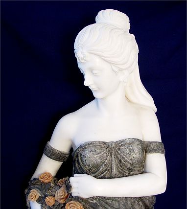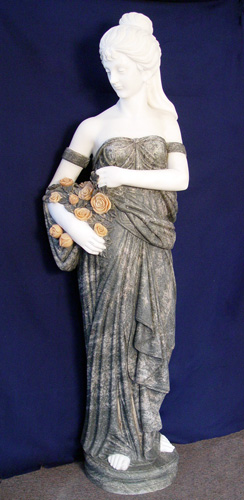 LIFE SIZE CARVED MARBLE GRECIAN MAIDEN: Soft white skin, variegated grey dress and carrying a carved pink roses, she stands on a 3 1/2''h. pedestal, 5'6'' overall.