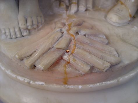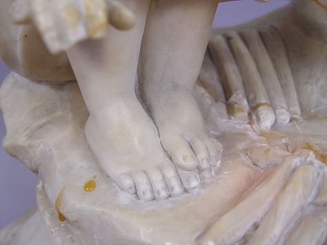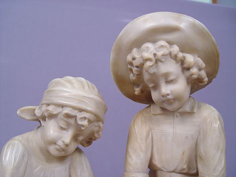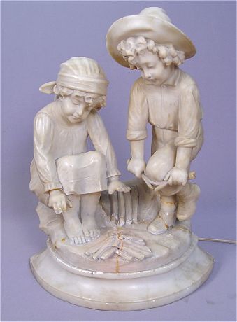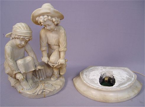 CARVED ALABASTER FIGURAL LAMP: Two children warming their hands at their fire. The light source shows under the fire. In as found condition. 19 1/2''h. 14''wide.