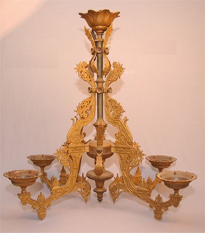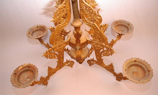 VINTAGE VICTORIAN OIL BURNING IRON CHANDELIER: Ornate iron and mixed metal with bronzed finish. Holds 4 glass oil lamps (not a matched set). 37 3/4''h. x 37''w. overall.