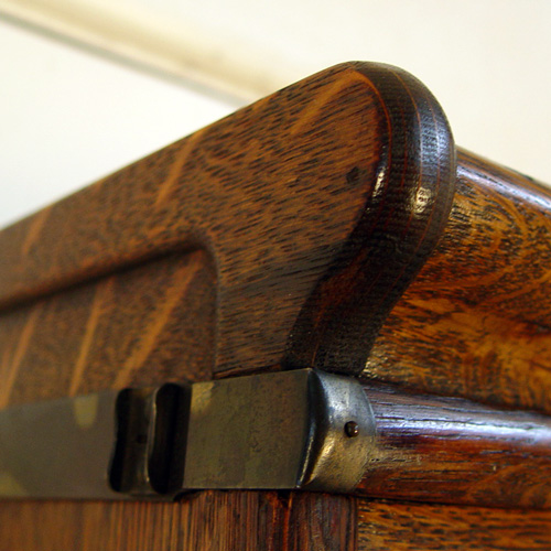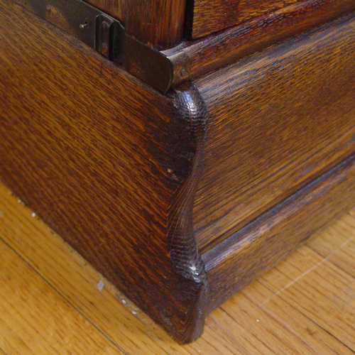 TIGER OAK GLOBE WERNICKI 5 STACK BOOKCASE: 3 of the sections have labels, D-8 1/2, D-10 1/4'' and D-12'', all are grade 297. Metal banding. 74''h. x 34''w., the base is 12 1/2'' deep. Est. $700/900**