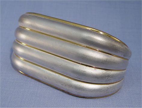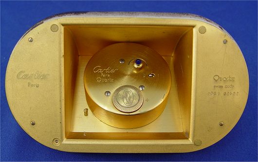 CARTIER QUARTZ DESK CLOCK: Back marked Cartier Paris, Quartz Swiss Made #7531-02382, jeweled sapphire stem, oval dial with Roman numerals marked Cartier Paris Swiss, date box at six o'clock. Exterior is silver finish with wear and gold tone bands, approx. 2 1/2''h., 5 1/2''l. All clocks and watches are sold as not working, due to their delicate nature, even though they may be just fine.