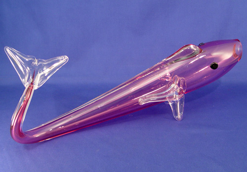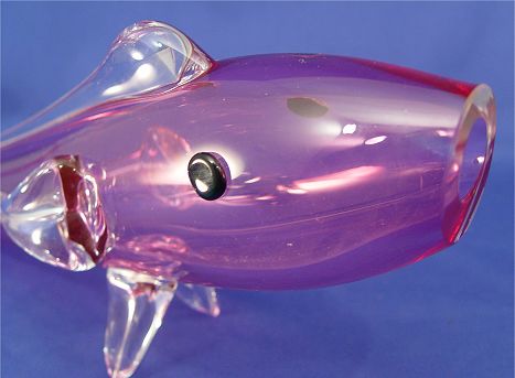MURANO CRANBERRY ART GLASS FISH: Cranberry pink body with open mouth, applied clear fins and black eyes, approx. 17 1/2''l. x 6 3/4''h.