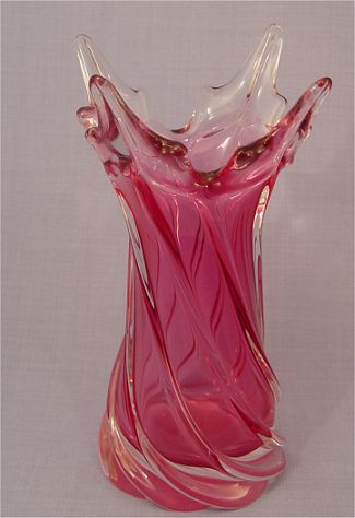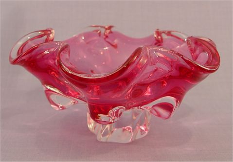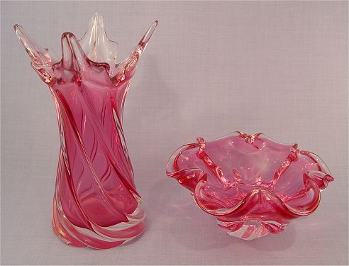 MURANO OR DANISH CRANBERRY ART GLASS: 2 pieces include a swirl vase, 12''h. and a bowl on high thick base. 10'' dia.