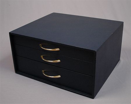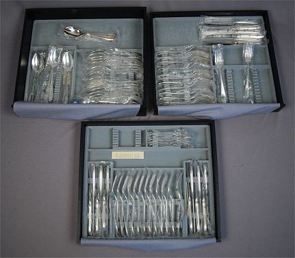 CHRISTOFLE ''VERSAILLES'' SILVERPLATED FLATWARE: 80 pieces new in their plastic covers. 26 dinner forks (8''), 26 tablespoons, 6 cocktail forks, and 22 dinner knives (9''l). Sold in the blue three drawer storage box.