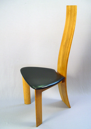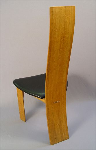 PAIR OF BENTWOOD DANISH MODERNE CHAIRS: Bands of oak form the curved back, black leather seat on a tripod of legs. 44''h., the seat is 20'' across.