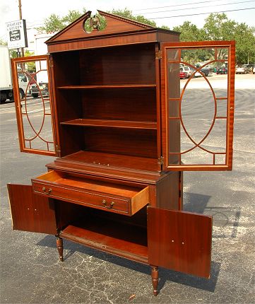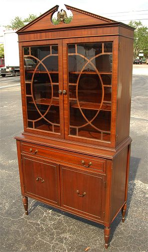 MAHOGANY SHERATON STYLE CHINA CABINET: Unusual circular fretwork on the doors, full length drawer over double doors. 73''h. x 35'' x 17''. Matching companion to the sideboard at lot 1304.