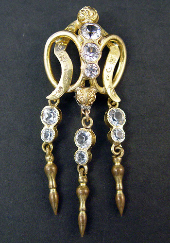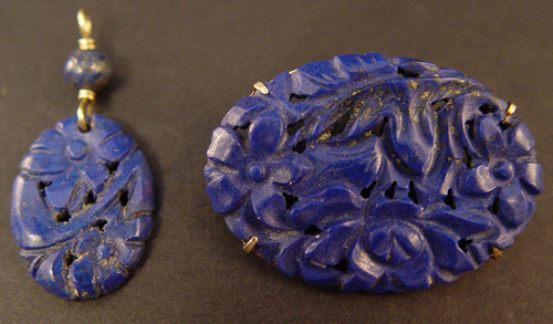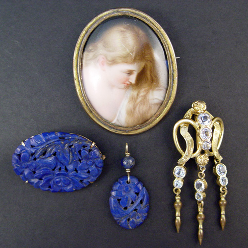 4 PC ESTATE LOT OF JEWELRY: To include, cameo pin inset with porcelain disk decorated with transfer image of maiden, 2''; lapis lazuli pierce carved pin set in 14k, 1 5/8''; matching lapis lazuli pierce carved pendant, 1 3/8''; gold tone metal pin, etched ribbon design and set with faceted clear stones or glass, 2 1/4''. Sold as a lot.